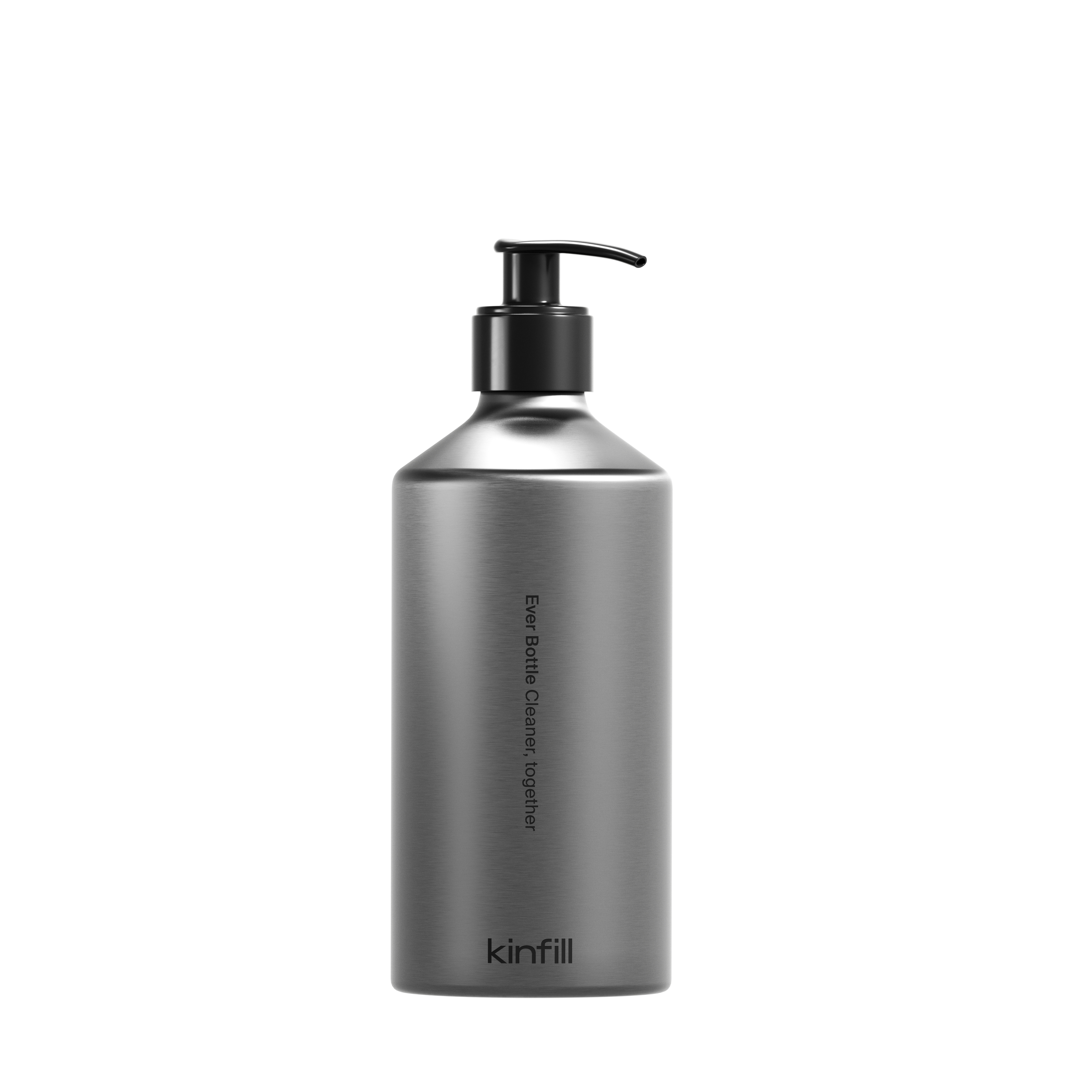 A lightweight 500ml empty aluminum bottle with a pump. Ideal for use with Kinfills cleaning refills for dish soap, laundry detergent and floor cleaner.