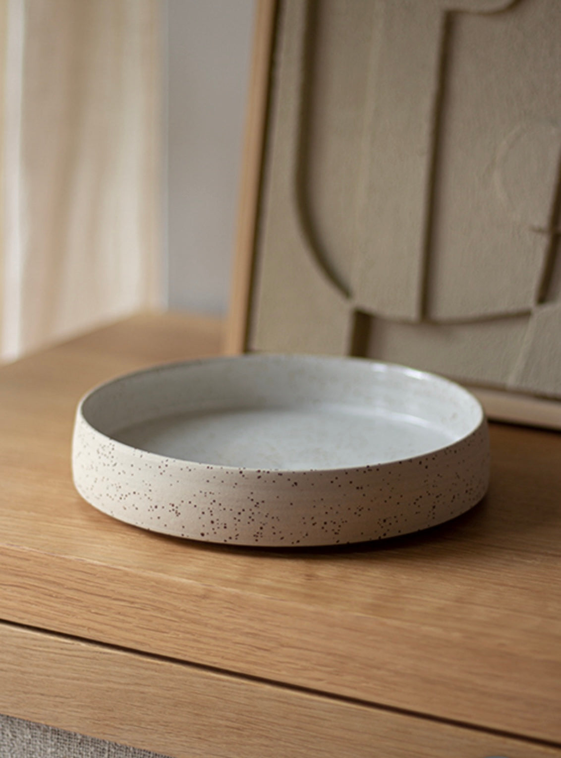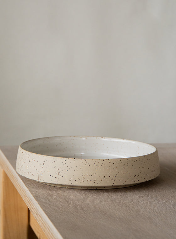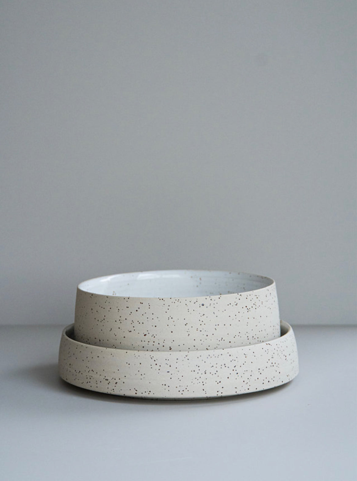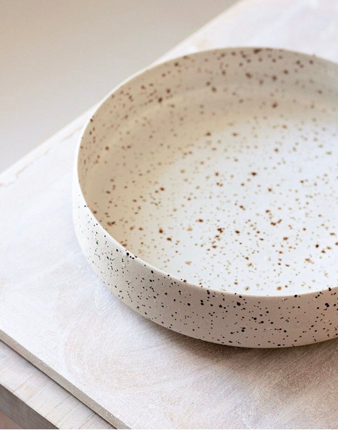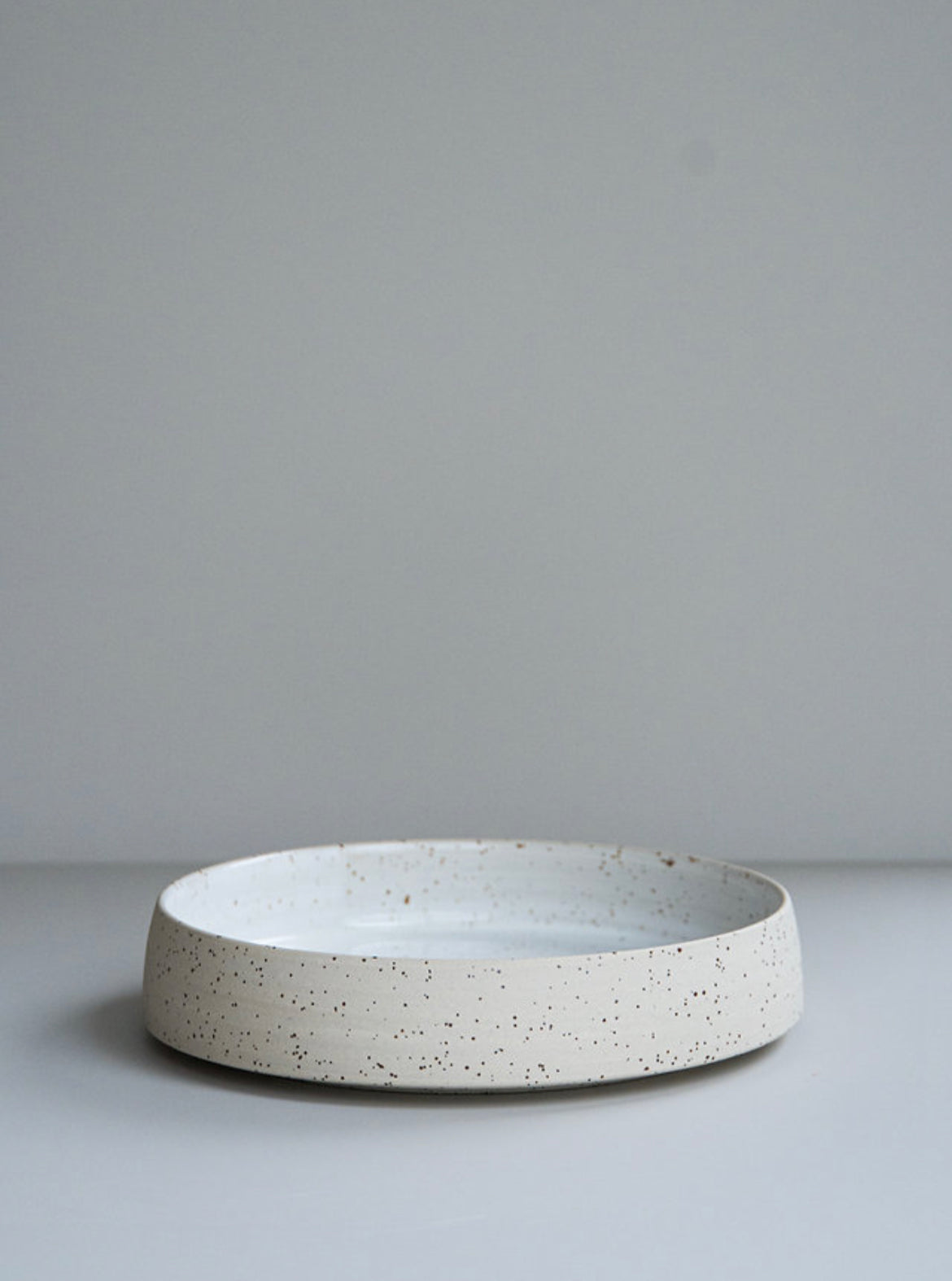 Hand-thrown bowl made out of speckled stoneware and glazed in a glossy white glaze. Great for salads, pasta or as a fruitbowl.