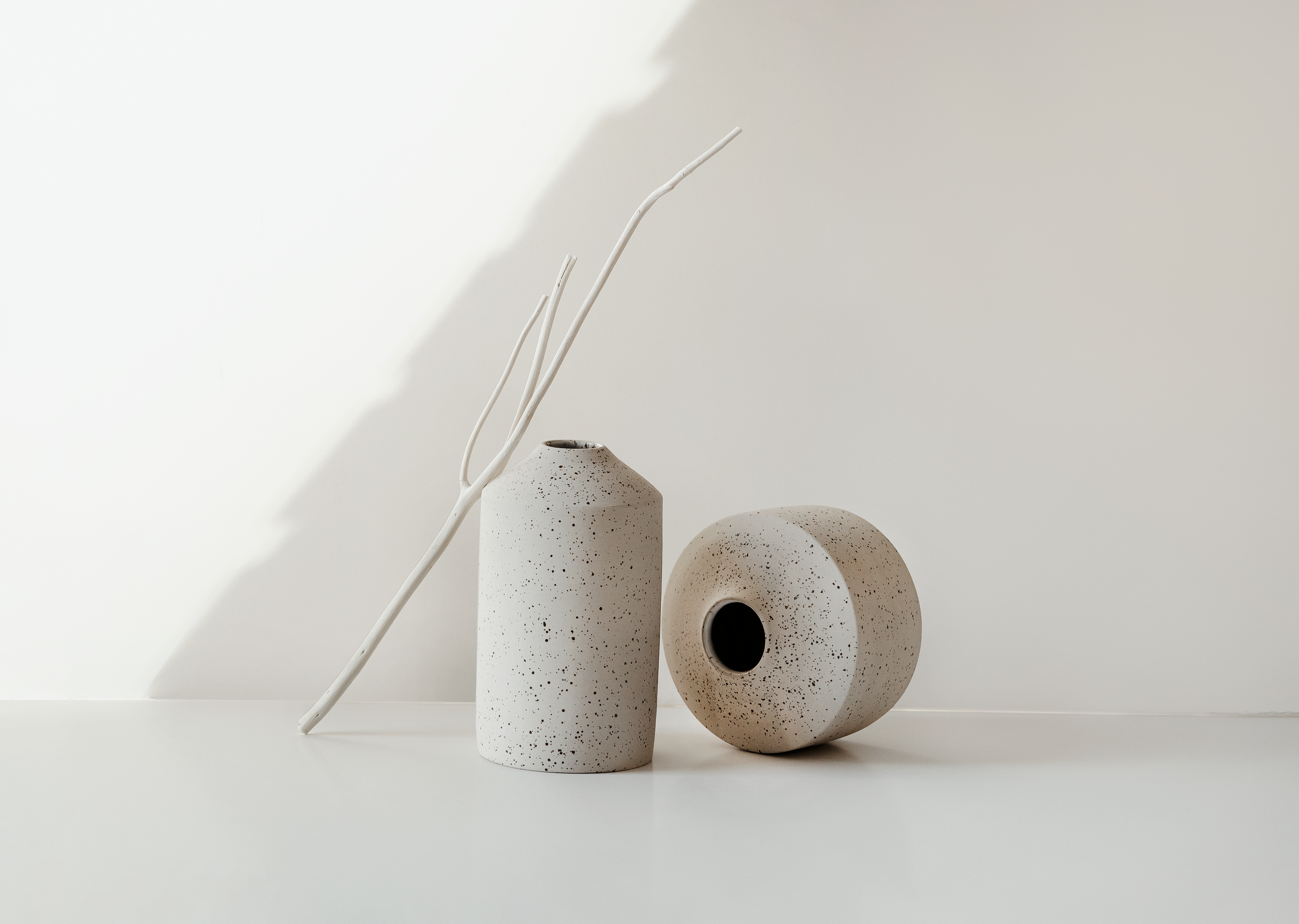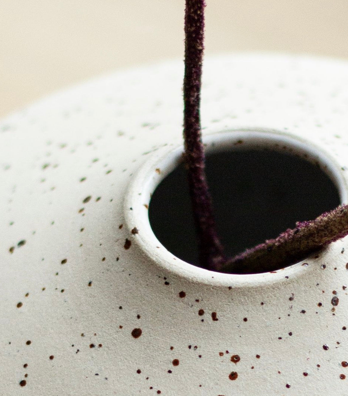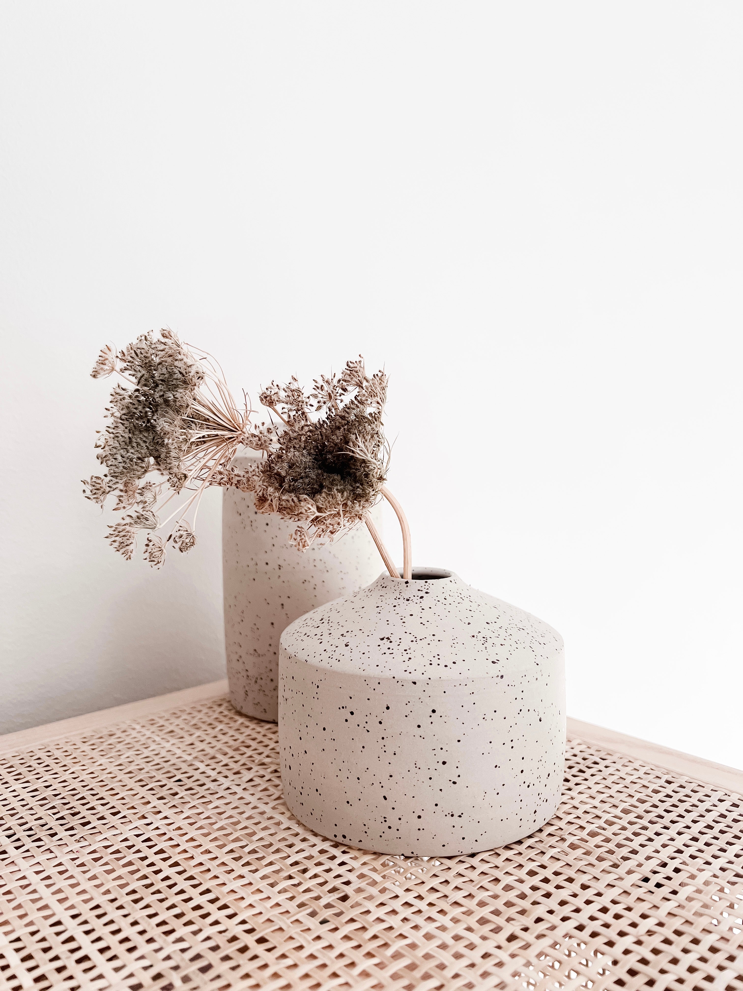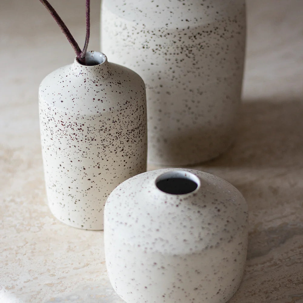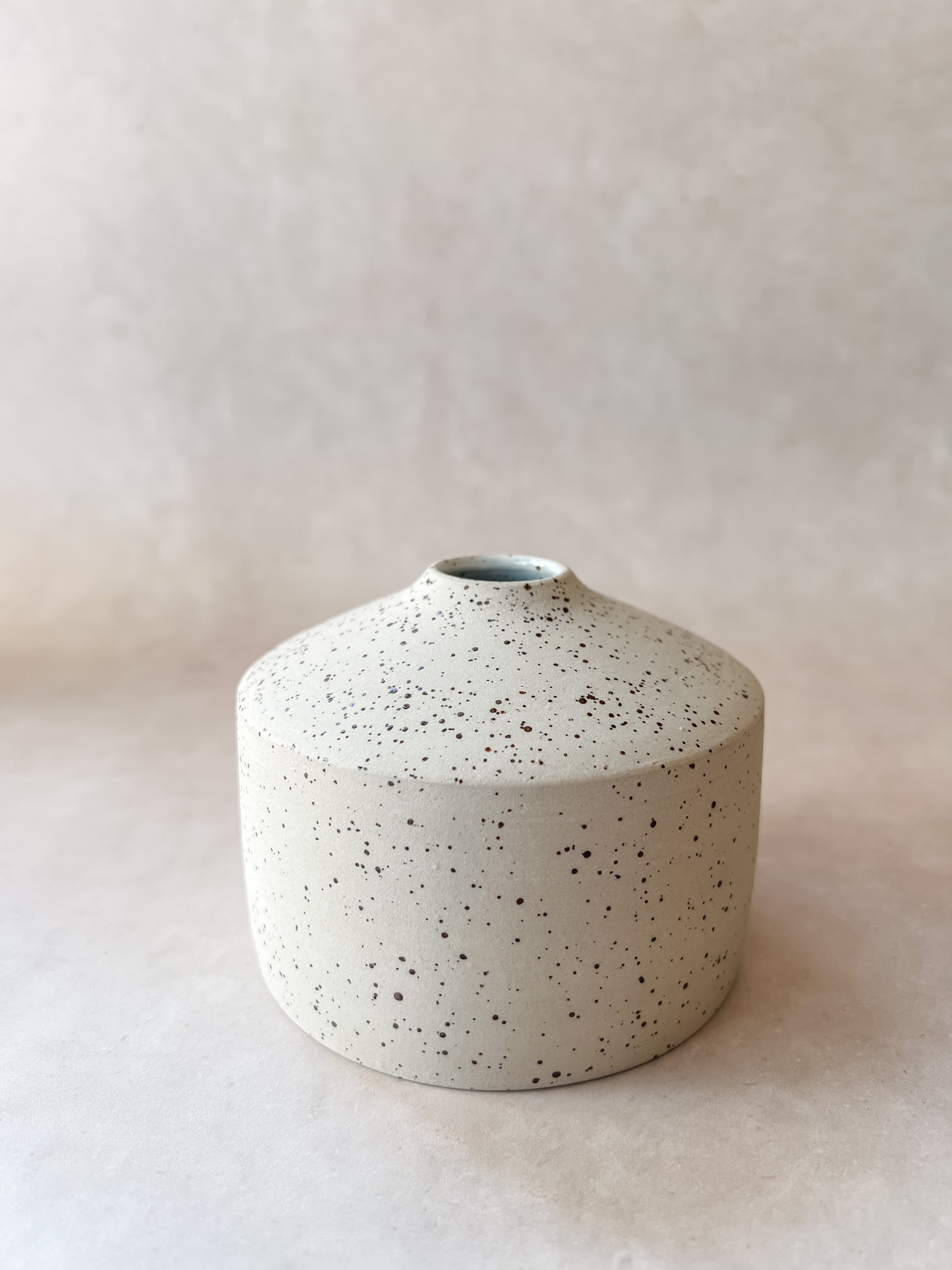 Hand-thrown small vase made out of speckled stoneware and glazed in white glaze.