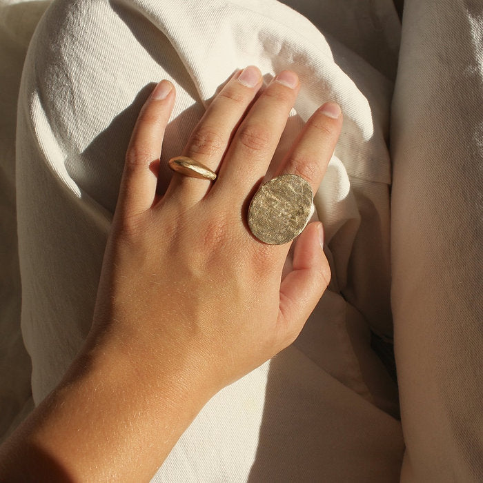 Made from solid, reclaimed bronze in a golden shade. The shape will be unique to the individual piece as they are sculpted by hand.